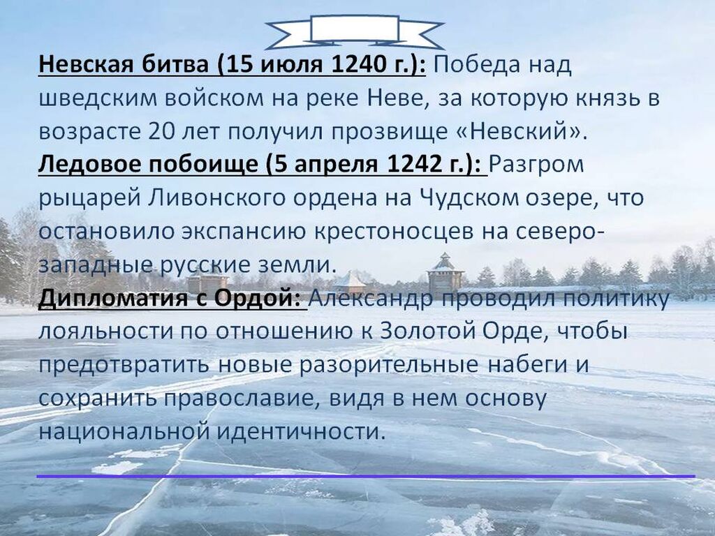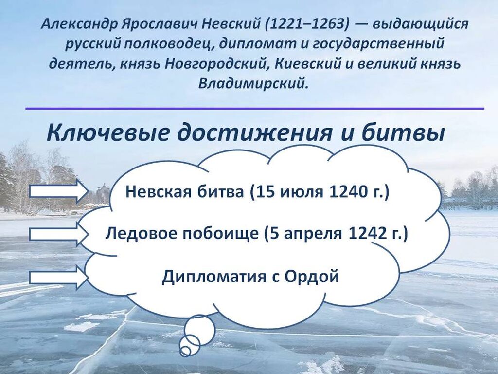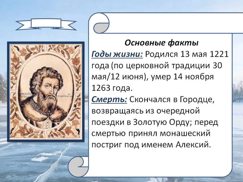 Александр Ярославич Невский (1221–1263) — выдающийся русский полководец, дипломат и государственный деятель, князь Новгородский, Киевский и великий князь Владимирский.
